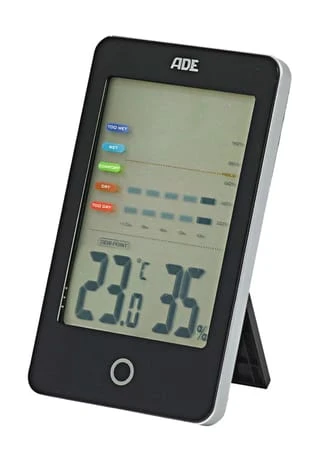 Das digitale Hygrometer von ADE prüft die Beschaffenheit Ihres Raumklimas. Es zeigt die relative Luftfeuchtigkeit in Prozent an und bietet ein Thermometer zur Messung von Temperatur, sowie Berechnung des Taupunkts. Das große LCD-Display (65 x 95 mm) und das Gehäuse aus robustem ABS-Kunststoff bieten eine gute Handhabung und Lesbarkeit. Die Bedienung über die präzisen Sensortasten ist einfach. Das Hygrometer lässt sich per Aufhänge-Öse als Wandhalterung oder mit ausklappbarem Standfuß benutzen. Temperaturanzeige in °C oder °F möglich.